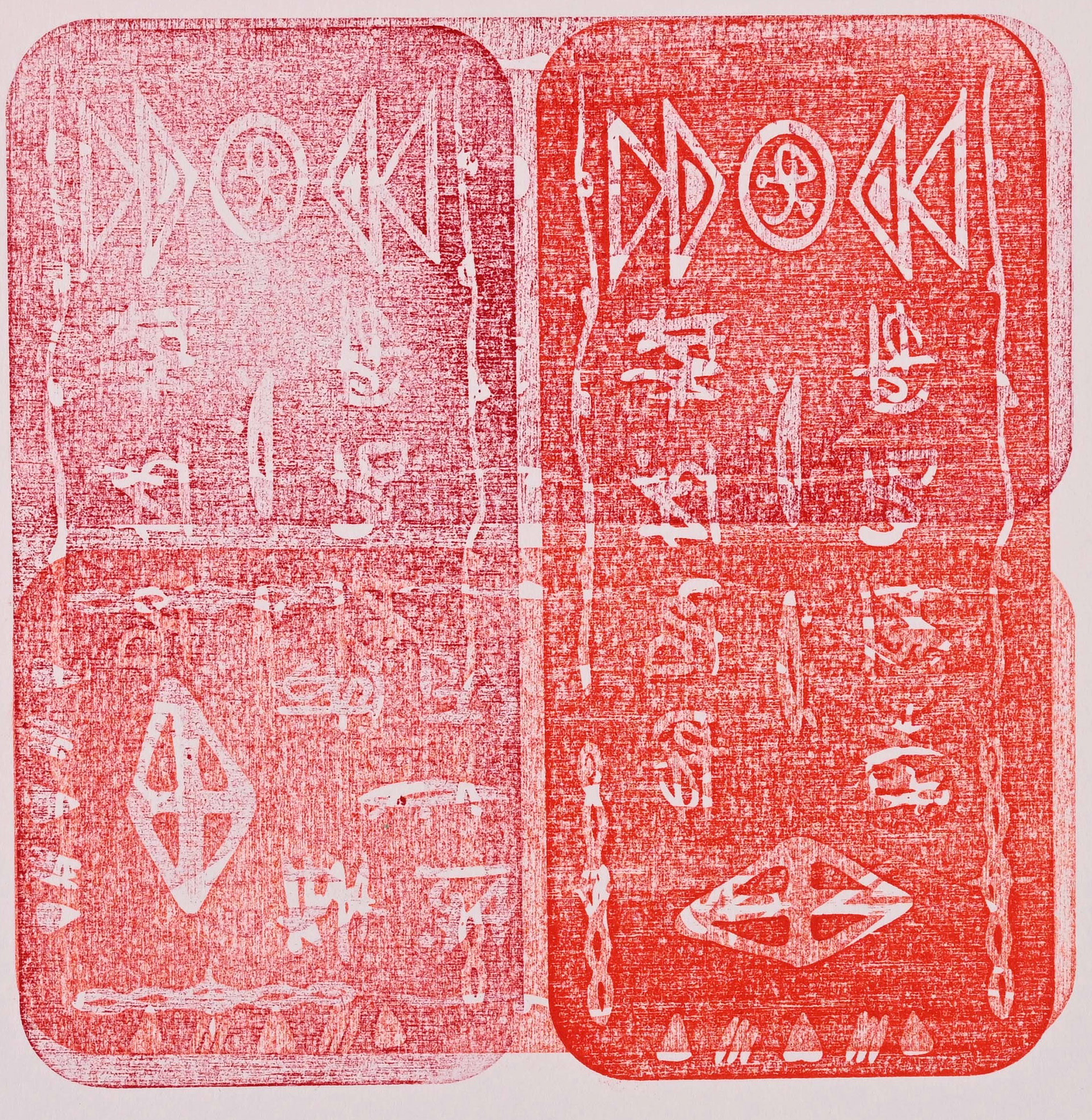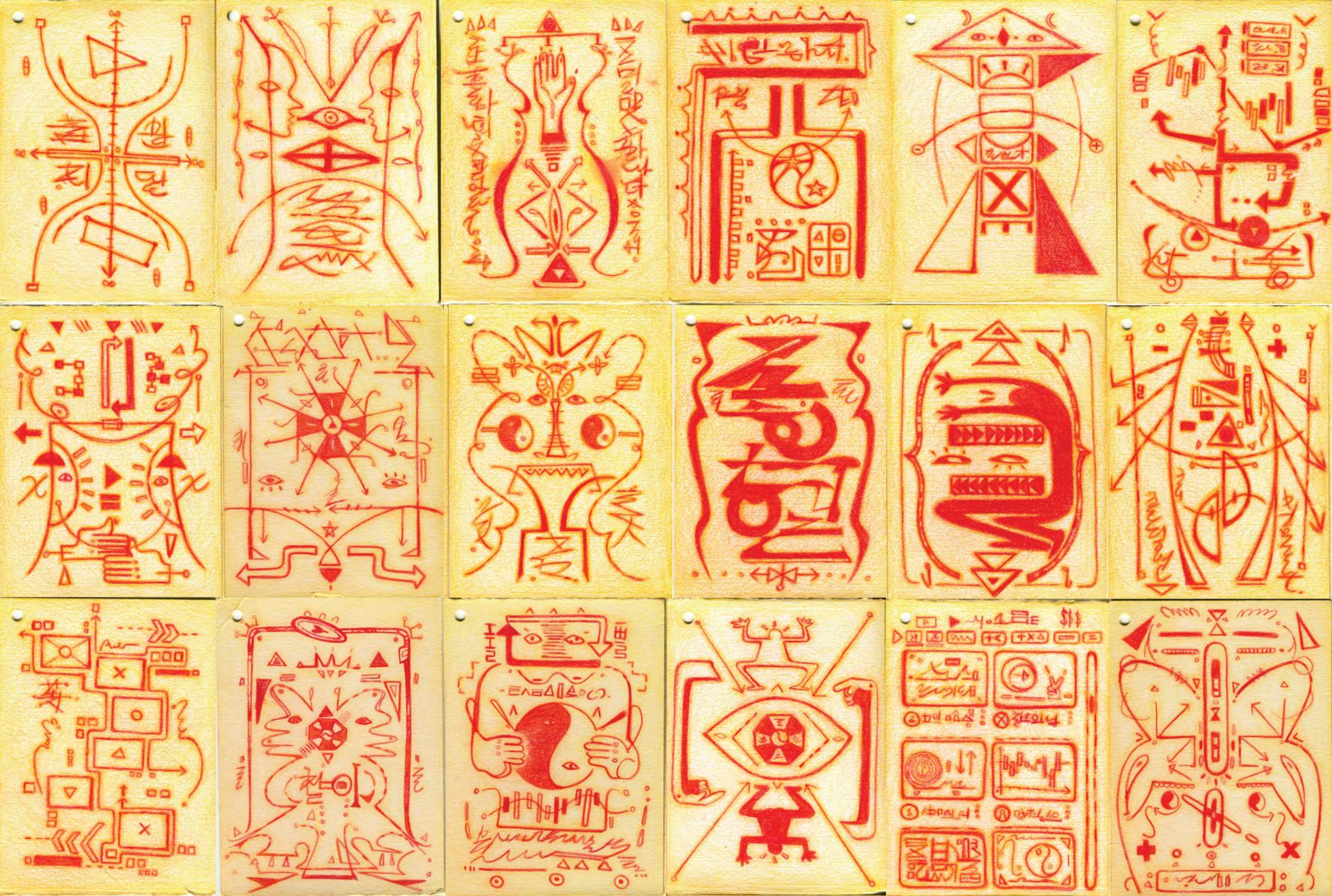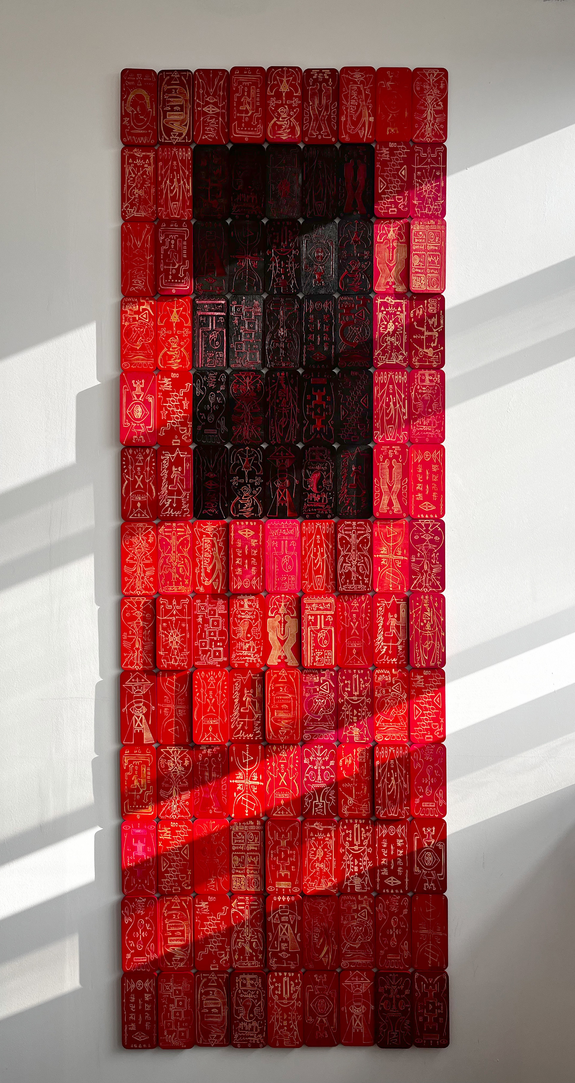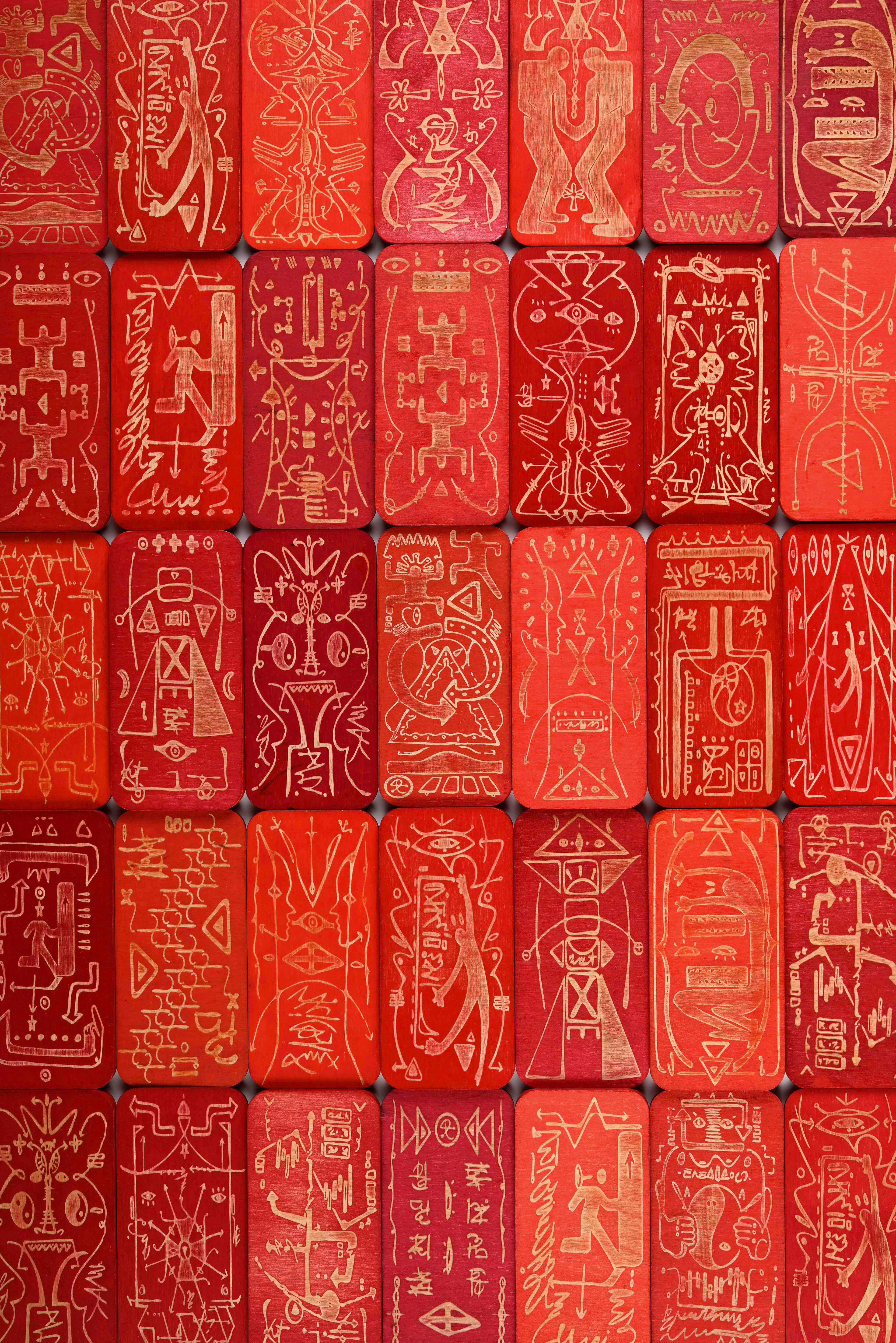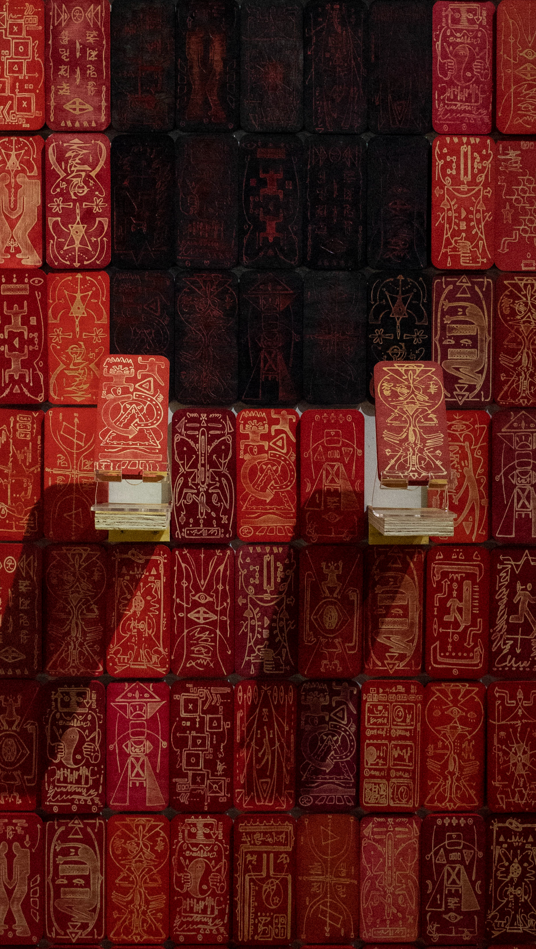 Blessed Are the Cryptic explores asemic and unintelligible signs and symbols that trigger our innate desire to decipher the unknown. The work stands like a monolith, as if it hold an authoritative power to the truth, yet it is filled with entanglement of mysterious drawings and writings, leaving our mind to wonder.