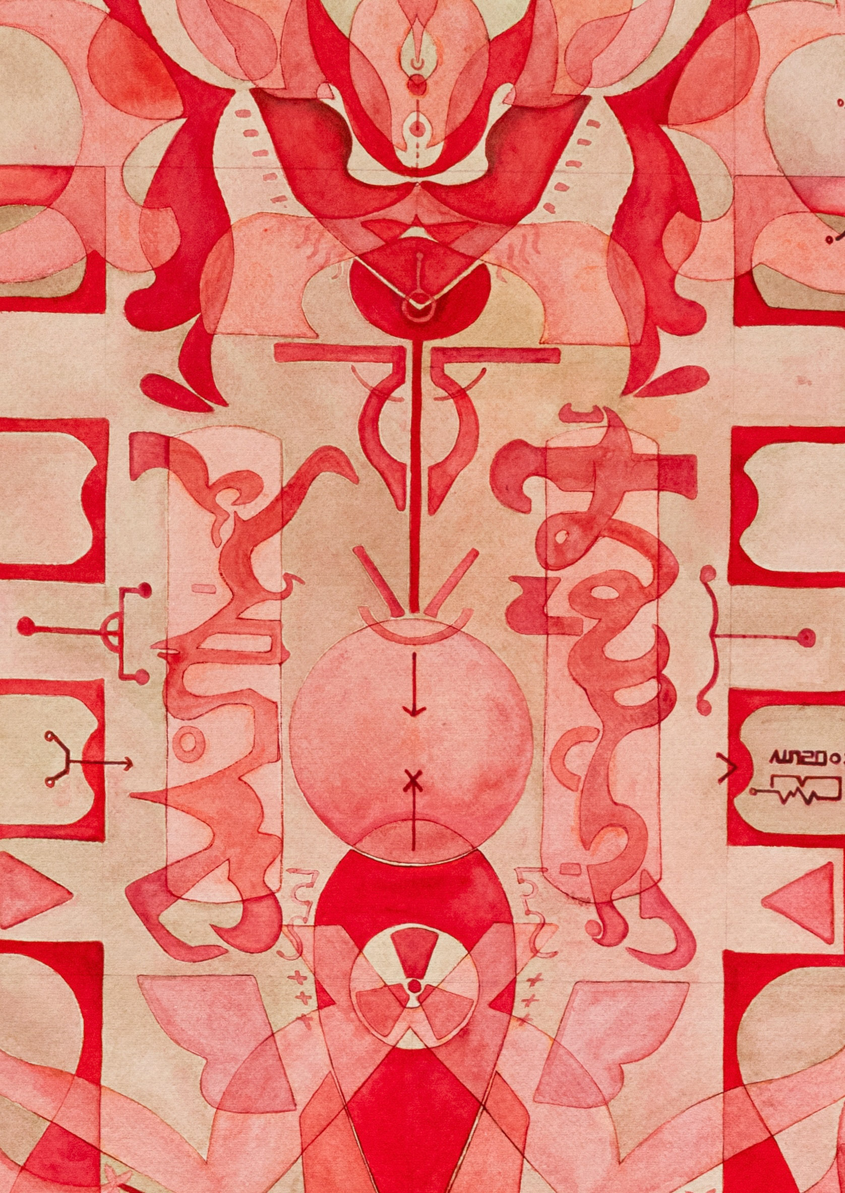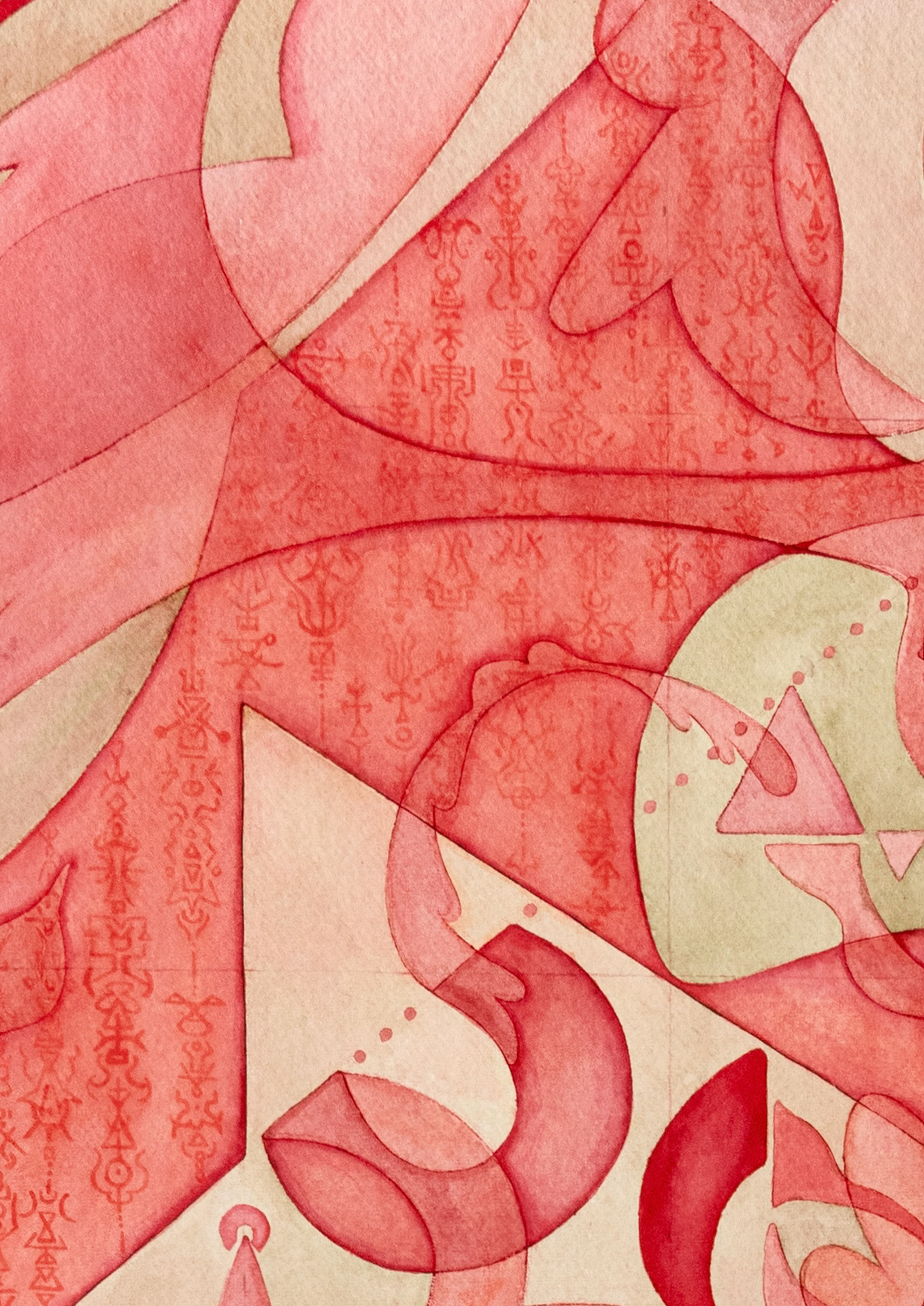 Wishful Thinking (2025) is the first in an ongoing large watercolor series that draws inspiration from Korean talismanic motifs. Layers of abstract shapes, asemic scripts, and symbolic forms interlace into a dense, architectural structure, suggesting both fragility and resilience. At once intricate and meditative, the work channels the traditional belief in drawing as a means of protection—against harm, misfortune, or unseen forces—while expanding it into a contemporary exploration of symbols, language, and desire.